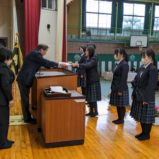 同窓会表彰および三世代表彰の表彰を行い、出口同窓会会長より卒業と入会にあたってのお祝いの言葉がありました。また卒業記念品の贈呈のあと、卒業生を代表してビジネスマネジメント科の蒲原敬人君が入会の言葉を述べました。